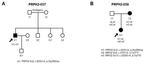 Pedigrees and segregation of families with atypical genotypes. (A) PRPH2-057, carrying homozygously p.Gly208Asp, and (B) PRPH2-058 carrying 3 different alleles in 2 genes, PRPH2 and IMPG2. Arrows indicate the proband in each family. m: pathogenic alleles; wt: wild-type alleles.