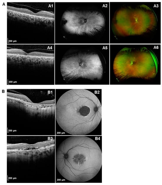 Retinal imaging of patients carrying PRPH2. Tomographic, fundoscopic and fundus autofluorescence (FAF) of right eye (RE) and left eye (LE) for 2 patients with disease-causing PRPH2 variants. (A) Patient PRPH2-058 is a 56-year-old female, with a diagnosis of early-onset retinitis pigmentosa, carrying the prevalent variant p.Gly208Asp in PRPH2, and biallelic variants in IMPG2 ((A1–A3): RE; (A4–A6): LE). OCT depicted the absence of extensive outer layers in both eyes affecting the fovea without cystic macular oedema. Fundoscopy revealed pale papilla with vascular attenuation, macula without pigmentary alterations, and absence of bone spicules but scattered pigmentary alterations in the periphery of both eyes. FAF images showed peripapillary atrophy with mottled hypoautofluorescence of the posterior pole, which was more evident in arcades, patches of atrophy in the extreme temporal periphery in RE and some small patches of atrophy in the extreme temporal periphery in LE. (B) Patient PRPH2-018-5 is a 61-year-old female, carrying the variant p.Arg142Trp, with a diagnosis of MD, for which clinical imaging shows a different severity in RE (B1–B2) and LE (B3–B4). OCT depicted well-delimited macular atrophy with the disappearance of outer retinal layers in RE and detachment of subfoveal neuroepithelium with thickening of the ellipsoid layer at this level in LE. FAF images showed well-demarcated hypoautofluorescence plaque affecting fovea with surrounding hyperaurofluorescence at its nasal rim and mottled hypo/hyperautofluorescence at its temporal rim in RE and central hypoautofluorescence with areas of reticular hyperautofluorescence within it in LE.