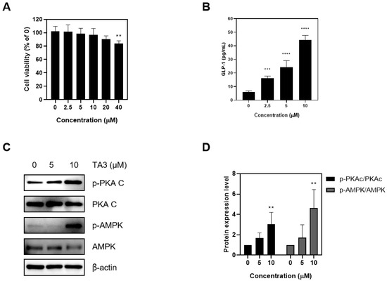 First, a cytotoxicity assessment at NCI-h716 was performed. Given the short drug-exposure duration (2 h), the toxicity was evaluated up to high concentrations. Ultimately, up to 20 μM of TA3 did not significantly affect cell viability (Figure 1A). To confirm the hypothesis that TA3 stimulates GLP-1 secretion in enteroendocrine L cells, TA3 was applied up to 10 μM, and the medium was collected to measure GLP-1 secretion using ELISA. A concentration-dependent increase in GLP-1 secretion was observed (Figure 1B). Subsequently, the protein expression of key signaling molecules in the GLP-1 secretion pathway was investigated. Increased phosphorylation of PKAc and AMPK was confirmed (Figure 1C). These results collectively suggest that TA3 does not exert significant cytotoxicity at concentrations up to 20 μM and significantly enhances GLP-1 secretion in a concentration-dependent manner in NCI-H716 cells. Furthermore, TA3 treatment leads to the increased phosphorylation of PKAc and AMPK, indicating its role in GLP-1 secretion.