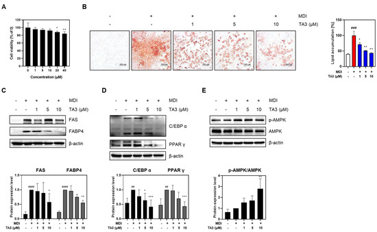 To assess cytotoxicity in 3T3-L1 adipocytes to TA3, a preliminary evaluation was conducted. Although the total drug exposure time was 8 days, toxicity was assessed after 48 h owing to media changes every 2 days. The results showed that no significant toxicity was observed up to 10 μM during the 48-h exposure. Thus, concentrations up to 10 μM were used in subsequent experiments (Figure 2A). Next, Oil Red O staining was performed to investigate the involvement of TA3 in adipogenic differentiation. The group treated with differentiation inducers showed a significant increase in lipid droplets and absorbance compared to the undifferentiated group. However, when treated with TA3, a concentration-dependent decrease in both lipid droplets and absorbance was observed. To further understand how TA3 inhibits adipogenesis in adipocytes, the expression of lipogenic factors, such as FAS and FABP4, was examined. These factors, which had increased owing to differentiation-inducer treatment, showed reduced expression levels upon TA3 treatment (Figure 2C). Key transcription factors involved in adipogenesis, C/EBPα and PPARγ, also exhibited increased expression following differentiation inducer treatment but were downregulated upon TA3 treatment (Figure 2D). Moreover, AMPK, a regulator of adipocyte differentiation and energy metabolism, showed dose-dependent increased expression upon TA3 treatment compared to the group treated with differentiation inducers alone (Figure 2E). In summary, the data collectively suggest that TA3 effectively inhibits adipogenesis, as evidenced by reduced lipid accumulation and the altered expression of key factors involved in adipocyte differentiation and lipogenesis.