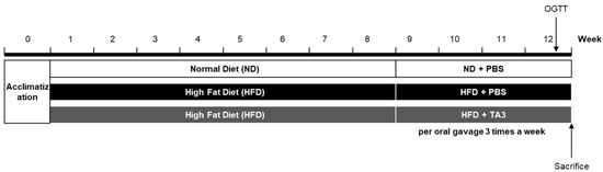 Following an adaptation period, mice were provided with a high-fat chow diet (D12492, RD 60% fat calorie) for 12 weeks, except for the normal-diet (ND) group. Starting from the 9th week of the high-fat chow diet, TA3 was orally administered at a dose of 10 mg/kg three times a week, with PBS serving as the vehicle. Throughout the study, all mice underwent regular weight measurements three times a week, while food intake was assessed once a week. At 1 week before the conclusion of the experiment, an Oral Glucose Tolerance Test (OGTT) was conducted to evaluate blood glucose levels. On the final day of the experiment, all mice were euthanized, and serum, liver tissue, epididymal white adipose tissue (eWAT), and inguinal white adipose tissue (iWAT) were collected. The weight of each tissue was recorded for further analysis.