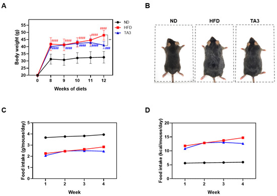 To assess the in vivo anti-obesity effect of TA3, a high-fat diet (HFD) experiment was conducted. Following a 1-week adaptation period, the animals were randomly divided into three groups (n = 5 each): the ND group, the HFD group, and the HFD + TA3 10 mg/kg treatment (TA3) group. The animal experiment schedule was conducted as shown in Figure 3. Weekly body weight measurements revealed that body weight significantly increased in the HFD group compared to that in the ND group by the 8th week of the HFD. However, after 4 weeks of 10 mg/kg TA3 oral administration, body weight gradually decreased compared to the HFD group, showing a significant difference in the final 12th week (Figure 4A). Indeed, visual observations of the body images of each group taken before dissection also revealed noticeable differences (Figure 4B). While the food intake (g) appeared notably lower in the HFD group compared to that in the ND group, there was a reduction in food consumption in the TA3-treated group, although this was evident (Figure 4C). However, when converted to kcal and recalculated, it was evident that the HFD group consumed significantly more kcal compared to the ND group. Furthermore, the administration of TA3 resulted in a substantial reduction in kcal intake compared to the corresponding HFD group (Figure 4D).