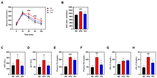 To evaluate the effect of TA3 on hyperlipidemia, we performed an OGTT. After a 16-h fasting period, the following day, 5 g/kg of glucose was orally administered, and the blood glucose levels were checked at 15, 30, 60, and 120 min. As a result, the HFD group maintained higher blood glucose concentrations for a longer period after the glucose intervention compared to the corresponding intervention in the ND group. In contrast, the TA3 group had a significant decrease in blood sugar concentration compared to that in the HFD group (Figure 5A). When comparing the AUC obtained to evaluate the OGTT, the HFD group showed higher measurements compared to the ND group, and the TA3 group exhibited a significant difference compared to the HFD group. (Figure 5B). All lipid profile factors were significantly elevated in the HFD-treated group compared to those in the ND group (Figure 5C–H). However, the concentrations of aspartate transferase (AST), alanine transaminase (ALT), TC, TG, and LDL were significantly reduced in the TA3 group compared to those in the HFD group. The difference between the concentration of HDL in the TA3 group and the HFD group was not statistically significant, suggesting that TA3 induces the recovery of serum lipid profiles in obese mice induced by an HFD.