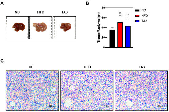 In accordance with several studies, in rodent models of non-alcoholic fatty liver disease, the consumption of an HFD is known to result in significantly brighter liver coloration [22]. To assess the effects of TA3 on hepatic tissue morphology, we observed tissue samples using visual analysis. As depicted in Figure 6A, liver tissues in the HFD group exhibited a lighter coloration compared to liver tissues in the ND group. Oral administration of TA3 significantly inhibited the morphological changes observed in liver tissues compared to the HFD group. Furthermore, liver weight increased in the HFD group compared to that in the ND group, while TA3 treatment led to a significant reduction in liver weight (Figure 6B). Moreover, in the HFD group, lipid droplets within hepatic cells appeared as small vacuoles, while in the TA3 group, the number and size of lipid droplets decreased compared to those in the HFD group (Figure 6C).