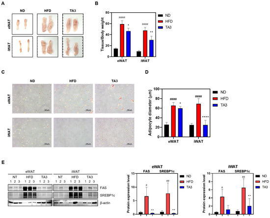 Effects of TA3 on white adipose tissue in high-fat diet-induced obesity mice model. (A) Macroscopic analysis of eWAT and iWAT. (B) Weight of each adipose tissue relative to body weight. (C) Mouse adipose tissue from each group was fixed, paraffin-embedded, and stained with H&E solution. Subsequently, they were imaged at 200× magnification under a microscope, and adipocyte diameter was quantified (D). (E) Expression of lipogenesis-related factors within adipose tissue. Data for each group are presented as means ± SEM. Significance was determined by comparing the data with those in the ND group: # p < 0.05, ## p < 0.01, and #### p < 0.0001. Additionally, significance was determined by comparing the data with those in the HFD group: * p < 0.05, ** p < 0.01, and **** p < 0.0001.