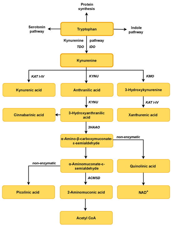 The Trp-KYN pathway is functional in the microbiota and the human host. It starts with the conversion of Trp by Trp 2,3-dioxygenase (TDO) or indoleamine 2,3-dioxygenases (IDO1 and IDO2), synthesizing N-formylkynurenine [,,]. IDO1 is expressed in the microglia, neurons and astrocytes, as well as in macrophages, fibroblasts and epithelial cells []. TDO, a rate-limiting enzyme, is detected mainly in hepatocytes and can be upregulated by Trp itself or by glucocorticoids []. Higher availability of Trp and its increased supply to the liver lead to enhanced TDO activity and stimulation of the Trp-KYN pathway []. N-formylkynurenine is rapidly converted to L-KYN by formamidase. In the brain and periphery, L-KYN is metabolized along two major enzymatic branches: (A) generating kynurenic acid (KYNA) in the process catalyzed by four kynurenine aminotransferases (KATs I–IV), or (B) producing 3-hydroxykynurenine (3-HK) and anthranilic acid (AA) by kynurenine 3-monooxygenase (KMO) and kynureninase, respectively [,]. Kynureninase may also metabolize 3-HK to 3-hydroxyanthranilic acid (3-HANA). KAT II, and possibly other KATs, may synthesize xanthurenic acid (XA) from 3-HK [,]. 3-HANA may yield α-amino-α-carboxymuconic-ω-semialdehyde (ACMS) in the process catalyzed by 3-hydroxyanthranilic acid 3,4-dioxygenase (3HAO). Under physiological conditions, ACMS spontaneously rearranges to form quinolinic acid (QUIN). Condensation of two molecules of 3-HANA yields cinnabarinic acid [,]. QUIN serves as an intermediate in the production of NAD+, an essential enzymatic cofactor [,]. Among all of the molecules from the Trp-KYN pathway, only Trp and KYN may penetrate the blood–brain barrier [,].