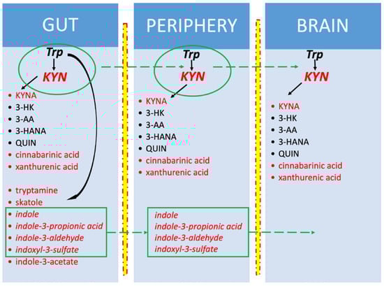 Tryptophan metabolites generated in the gut, periphery and brain. In red—AhR ligands; in italics—metabolites penetrating through the blood–brain barrier. Tryptophan (Trp) and kynurenine (KYN) are also easily transported into the brain. Kynurenines are produced in all three compartments, in contrast to indoles, which are synthesized only in the gut. In the brain, Trp comes from ingested proteins, and KYN originates from Trp metabolism in the gut and peripheral organs and from the conversion of Trp in situ. Other brain kynurenines are produced locally within the brain.