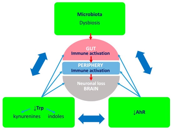 In the gut, free Trp from dietary proteins is absorbed within the small intestine into the systemic circulation. The remaining Trp is transported into the colon and utilized by the microbiota. Indeed, germ-free mice, completely deprived of all commensal microorganisms, exhibit high central and peripheral Trp levels []. Moreover, as mentioned before, antibiotic therapy leading to the eradication of microbiota was shown to alleviate MPTP-induced neurotoxicity []. The beneficial effects of microbiota depletion may result from the modulation of the availability of serum Trp and its metabolites.