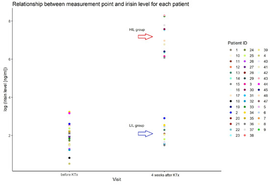 We found an outstanding increase in ISL measured after KTx, reaching more than 1000 times in 44% of patients (21/47) (HIL). The increase appeared at the first measurement (one week after KTx) and remained stable for at least a month. The median value of all measurements after the KTx procedure in the group with an increase in ISL was 1220 ng/mL (min–max: 158–5884), and in the group without irisin increase (LIL), it was 6 ng/mL (min–max: 2–20) (Figure 1).