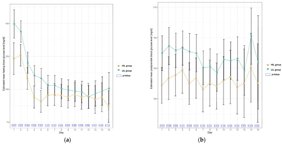 Plots of estimated mean with 95% confidence interval in blood glucose level [mg/dL] in patients with and without irisin increase (HIL and LIL group) during 15 days after KTx. (a) Mean fasting blood glucose level; (b) mean postprandial blood glucose level.