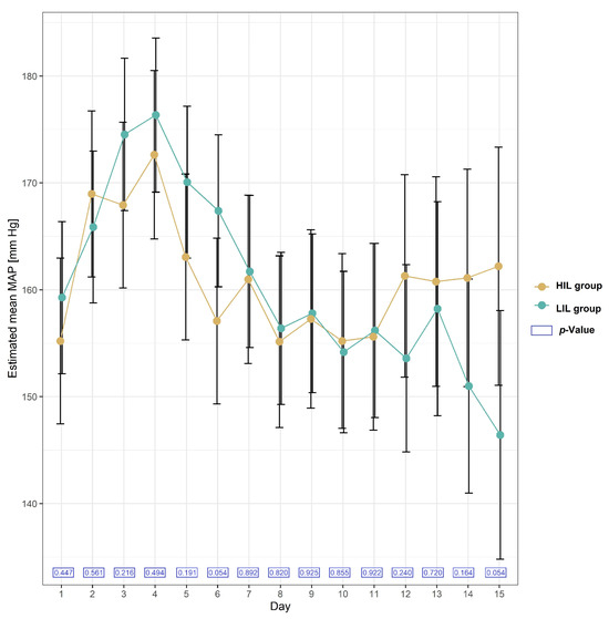 Plot of estimated mean with 95% confidence interval in MAP (Mean Arterial Pressure) [mmHg] in patients with and without irisin increase (HIL and LIL group) during 15 days after KTx.