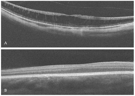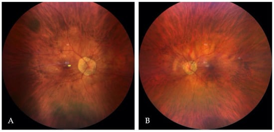 In this patient, the best-corrected visual acuity (BCVA) was 0.2 in the right eye (RE) and 0.3 in the LE (LE). The refraction of the RE was −12.0 diopters of spherical power (DS)/−0.25 diopters of cylinder power (DC) × 30° and of the LE was −7.25 DS/−0.75 DC × 170°. Color vision testing showed a protanomalous color vision deficit. Horizontal jerk nystagmus without compensatory head alignment was present. An anterior segment examination revealed posterior subcapsular cataract OU (more advanced in the RE). However, no trans-illumination of the iris was observed. An examination of the eye fundus demonstrated a slightly pale optic disc surrounded by an atrophic area, diffuse thinning, and moderate hypopigmentation of the retina with visible choroidal vasculature OU (Figure 1A,B). Fundus autofluorescence (FAF) imaging (Spectralis HRA, Heidelberg Engineering, Heidelberg, Germany) of the posterior pole was within the normal limit OU, whereas optical coherence tomography (OCT) (Avanti Widefield, Optovue, Fremont, CA, USA) revealed retinoschisis in the RE and foveal hypoplasia in the LE (Figure 2A,B).
