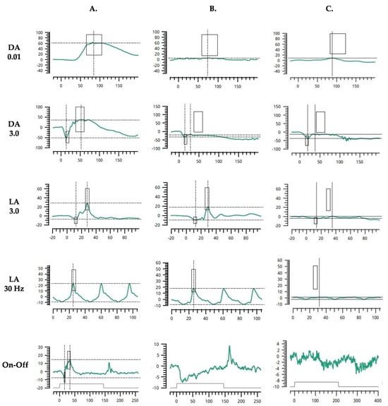 Visual evoked potentials (VEPs) were assessed with the RETI-port/scan21 unit (Roland Consult, Wiesbaden, Germany) in accordance with the standards of the International Society for Clinical Electrophysiology of Vision (ISCEV) []. Examinations revealed low amplitudes and delayed latencies of the P100-waves in pattern VEPs (PVEPs) and P2-waves in flash VEPs (FVEPs). There was no inter-hemispheric difference when each eye was tested independently. Flash full-field electroretinography (ffERG) was tested, using the RETeval portable device (LKC, USA) and sensor strip electrodes, in accordance with the standards of the ISCEV []. The light-adapted (LA) 3.0 ffERG (single-flash cone response) and LA 3.0 flicker ffERG (30 Hz flicker) were consistent with severely reduced amplitudes OU. Likewise, the isolated rod response in dark-adapted (DA) 0.01 ffERG was almost completely suppressed bilaterally. Moreover, in DA 3.0 ffERG assessing the combined rod–cone response, the amplitudes of the a-waves were about 10.–20. percentiles (normal range from −22.0 μV to −79.0 μV) and the amplitudes of the b-waves were abolished, which results in a negative pattern of the ERG. On-Off ffERG protocols revealed unmeasurable function of both the ON and OFF cone bipolar pathways (Figure 3A–C).