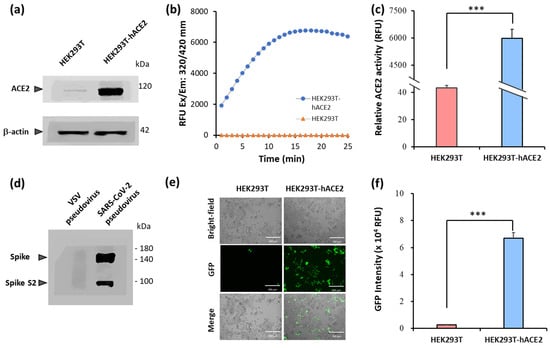 A pseudovirus system was established to evaluate the binding efficacy of the viral spike protein to the hACE2 receptor. In the pseudovirus system, HEK293T cells stably expressing hACE2, named HEK293T-hACE2, were infected with a SARS-CoV-2 spike pseudovirus. The binding efficacy was quantified using the green fluorescent protein (GFP) intensity of the pseudovirus-infected cells. To characterize the hACE2 in the cells, the protein expression and enzyme activity of hACE2 were measured through Western blot and enzyme activity assays, respectively. The protein expression of ACE2 in HEK293T-hACE2 cells was significantly higher than that in HEK293T cells (Figure 1a). The results in Figure 1b,c show that the hACE2 activity level was higher (6000 RFU) in HEK293T-hACE2 cells than in HEK293T cells (44 RFU). These results indicate the increased expression of hACE2 in HEK293T-hACE2 cells compared with that in HEK293T cells (p < 0.001).
