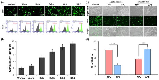 Infection efficiency of SARS-CoV-2 spike variant pseudovirus and inhibitory efficacy of spike and hACE2 blockers. GFP images and flow cytometry analysis represent HEK293T-hACE2 cells that were infected with pseudoviruses expressing the spike proteins of Wuhan, Alpha, Beta, Delta, BA.1, and BA.2. strains (a). GFP intensity was detected with a Synergy HT multimode microplate reader (b). GFP images of HEK293T-hACE2 cells infected with SARS-CoV-2 BA.2 spike pseudovirus (c). The inhibitory efficacy of spike and hACE2 blockers preincubated with pseudovirus or cells (d). All values are expressed as the mean ± SD (n = 5) for each group. The statistical comparison among groups was conducted using Student’s t-test; *** p < 0.001 vs. SPV or APV group. SPV, SPC, APV, and APC are defined in Table 1.