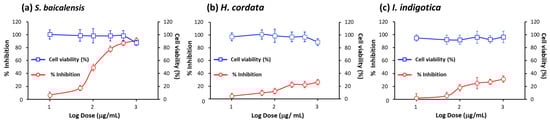 Assessment of inhibitory efficacy of S. baicalensis, H. cordata, and I. indigotica against SARS-CoV-2 BA.2 spike pseudovirus infection. The inhibitory efficacy and cell viability of S. baicalensis (a), H. cordata (b), and I. indigotica (c) were quantified using a Synergy HT multimode microplate reader at final concentrations of 0, 10, 100, 250, 500, and 1000 μg/mL for 24 h. All values are expressed as mean ± SD for each group (n = 5).