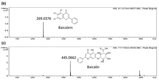 LC-MS fingerprint profiles of S. baicalensis extract. LC profiles of the TCM compound were obtained with an Impact HD Q-TOF mass spectrometer through ESI/MS experiments. Ten major constituents were found in the S. baicalensis extract (a). ESI/MS negative-mode mass spectra fingerprint of baicalein (b). ESI/MS negative-mode mass spectra fingerprint of baicalin (c).