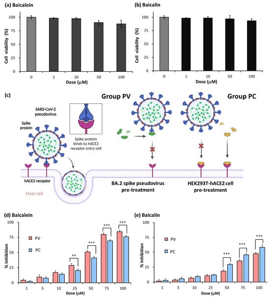 Assessment of inhibitory efficacy of baicalein and baicalin against SARS-CoV-2 BA.2 spike pseudovirus infection. The viability of HEK293T-hACE2 cells treated with baicalein was quantified via MTT assay (a). The viability of HEK293T-hACE2 cells treated with baicalin was quantified via MTT assay (b). Experimental scheme indicating the pseudovirus pretreatment (PV group) and the cell pretreatment (PC group) of baicalein and baicalin (c). The inhibitory efficacy of baicalein pretreated with SARS-CoV-2 BA.2 spike pseudovirus and HEK29T-hACE2 cells was quantified using a Synergy HT multimode microplate reader (d). The inhibitory efficacy of baicalin pretreated with SARS-CoV-2 BA.2 spike pseudovirus and HEK29T-hACE2 cells was quantified using a Synergy HT multimode microplate reader (e). Red color (PV group): baicalein and baicalin pretreated with SARS-CoV-2 spike pseudovirus. Blue color (PC group): baicalein and baicalin pretreated with HEK293T-hACE2 cells. All values are expressed as mean ± SD for each group (n = 5). The statistical comparison between groups was conducted using Student’s t-test; ** p < 0.01 and *** p < 0.001 vs. PV group.