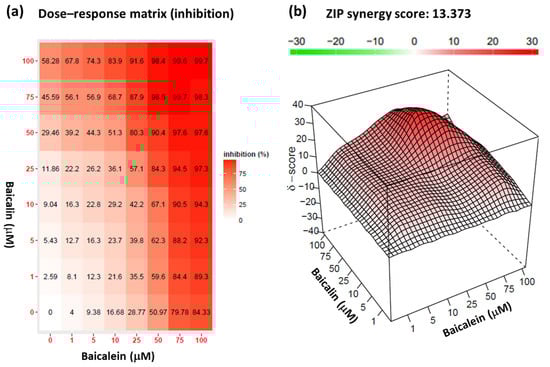 Synergism between baicalin and baicalein. Dose–response map for a synergistic drug combination (baicalein and baicalin) (a). ZIP synergy score map for the same drug combination (b). The interaction results are shown in both 2D and 3D. δ, excess % inhibition beyond the expectation predicted with the ZIP model.