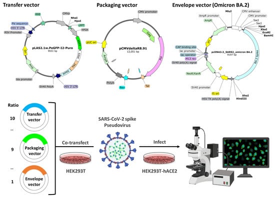 As shown in Figure 7, the lentivirus packaging system was used to produce the SARS-CoV-2 spike pseudovirus. Three vectors were chosen for construction: pCMVΔR8.91, pLAS2.1w.PeGFP-I2-Puro (RNAiCore, Taipei, Taiwan), pcDNA3.1-SARS2-Spike, and pcDNA3.3_SARS2_Omicron BA.2 (Addgene, Watertown, MA, USA). HEK293T was seeded onto a 24-well plate and cultured for 24 h. Then, 15 μg of plasmid DNA (ratio of transfer vector: packaging vector/envelope vector = 10:9:1) and Lipofectamine 2000 Transfection Reagent (Thermo Fisher Scientific) were co-transfected into HEK293T cells. The pseudovirus was harvested 72 h after transfection for the experiments. The HEK293T-hACE2 cells were infected with the pseudovirus for 24 h at 37 °C. After the incubation, the virions were removed, and the infected cells were cultured in fresh medium for another 72 h. The GFP of the cells was observed via microscopy at 72 h after infection. Additionally, the cells were collected 72 h after infection to analyze the GFP intensity using a Synergy HT multimode microplate reader (BioTek Instruments).
