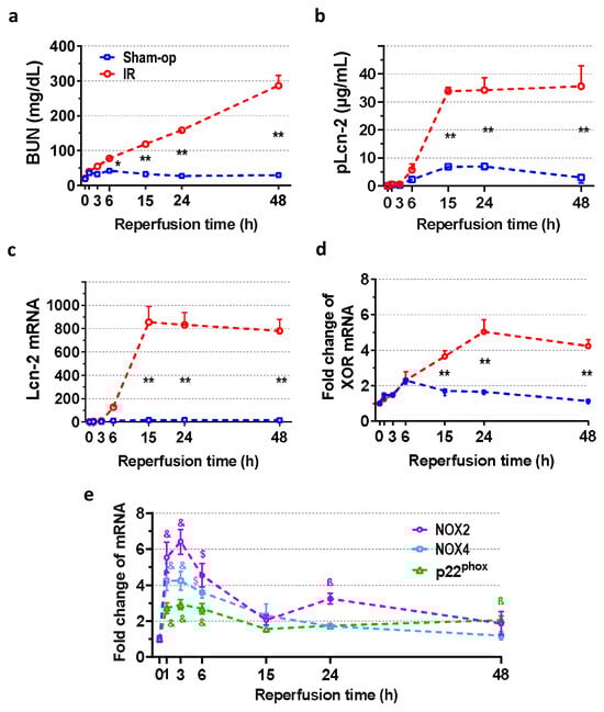 Time course of postischemic kidney function and expression of oxidase enzymes after 30 min of ischemia. Functional marker BUN indicates an early onset of oxidative damage as NOX is upregulated. The elevation of the injury marker Lcn-2 between 6 and 15 h implies ongoing parenchymal injury. (a) Blood urea nitrogen (BUN), (b) lipocalin-2 (Lcn-2) plasma concentration, (c) renal Lcn-2 gene expression, (d) XOR mRNA expression and (e) NOX mRNA expression. Sham-op: sham-operated group. IR: ischemia–reperfusion group. (a–d) * p < 0.05, ** p < 0.0001 vs. sham-op. (e) ß p < 0.05, $ p < 0.001, & p < 0.0001 vs. 0 h group. Two-way ANOVA with Sidak post hoc test. n = 5/group/time.