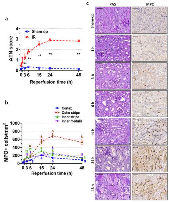 Postischemic time course of renal morphology and neutrophil infiltration after 30 min of ischemia. Similar to function, morphology indicates an early start of oxidative injury resulting in neutrophil infiltration. (a) Acute tubular necrosis (ATN) score, (b) MPO+ cell count/mm2, (c) periodic acid-Schiff (PAS) staining, and myeloperoxidase (MPO) immunohistochemistry. Scale bar: 50 μm. Sham-op: sham-operated group. IR: ischemia–reperfusion group. (a) ** p < 0.0001 vs. sham-op. (b) ß p < 0.05, ¤ p < 0.01, $ p < 0.001, & p < 0.0001 vs. 0 h group. Two-way ANOVA with Sidak post hoc test. n = 5/group/time.