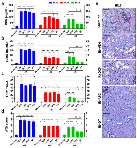 The non-selective NADPH oxidase inhibitor, apocynin, attenuated kidney injury and morphological damage after IR, but its protective effect depended on the severity of ischemia. Inhibition of xanthine oxidoreductase (XOR) activity or expression was ineffective, and kidney-specific NOX4 did not contribute to renal IRI. (a) BUN, (b) Lcn-2 plasma concentration, (c) renal Lcn-2 gene expression, (d) ATN score, (e) renal histology (PAS staining; scale bar: 50 μm). Sham-op: sham-operated group. IR: ischemia–reperfusion group. IR15/20/30 refers to the length (min) of ischemia. VEH: vehicle, APC: apocynin, OXP: oxypurinol, DT: double treatment. * p < 0.05, ** p < 0.01, *** p < 0.001, **** p < 0.0001 vs. sham-op. # p < 0.05, ## p < 0.01 vs. IR + VEH. One-way ANOVA with Dunnett post hoc test (IR30: n = 6-5-7-7-6; IR20: n = 5-7-7-6-6; IR15: n = 6-8-7-7-7).
