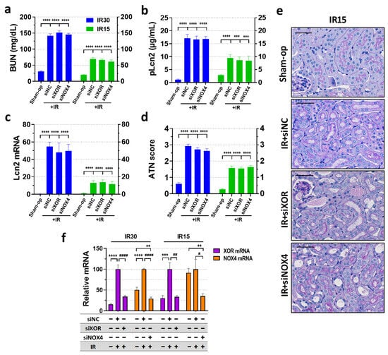 In the RNAi experiments, renal IR significantly increased all renal injury markers (BUN, Lcn-2 concentrations and Lcn-2 mRNA) and morphological damage (ATN score) at 24 h after severe (30 min) and mild (15 min) ischemia (Figure 4a–e), similarly to that of the enzyme inhibition experiment. Despite successful silencing of XOR and NOX4, kidney function was not improved after either severe (30 min) or mild (15 min) renal ischemia (Figure 4a–c). Histological sections of the siRNA-silenced groups showed similar morphological damage in the kidneys to that of the control IR animals (Figure 4d,e).