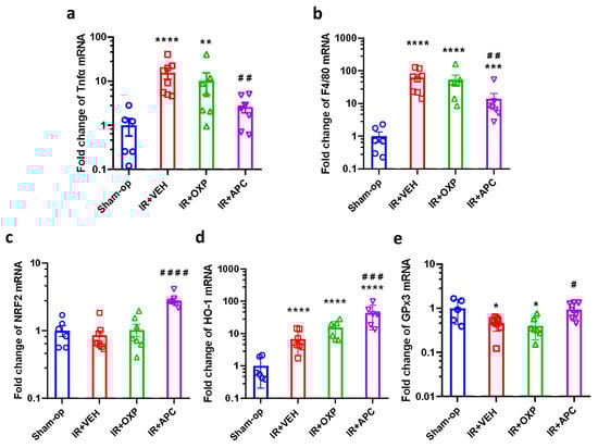 The decrease in TNF-α and F4/80 expression indicated less inflammation after NADPH oxidase inhibition with apocynin after mild ischemia–reperfusion. Oxidative stress-related gene upregulation by apocynin demonstrated greater protection against oxidative stress. (a) TNF-α, (b) F4/80, (c) NRF2, (d) HO-1, (e) GPx3 mRNA expression. Sham-op: sham-operated group. IR: ischemia–reperfusion group. VEH: vehicle, APC: apocynin, OXP: oxypurinol, * p < 0.05, ** p < 0.01, *** p < 0.001, **** p < 0.0001 vs. Sham-op. # p < 0.05, ## p < 0.01, ### p < 0.001, #### p < 0.0001 vs. IR + VEH. One-way ANOVA with Dunnett post hoc test (sham n = 6, IR + VEH n = 8, IR + inhibitor groups n = 7).