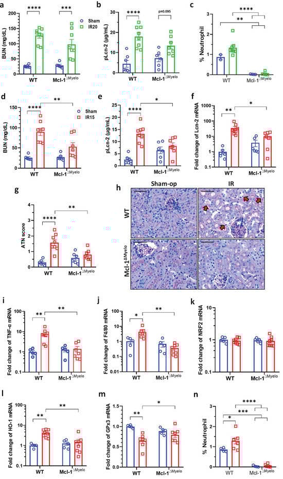 After 20 min ischemia, BUN and Lcn-2 concentrations were increased in WT compared to sham-operated animals (Figure 6a,b). Similar increases were observed in the neutrophil-deficient Mcl-1ΔMyelo mice after 20 min ischemia (Figure 6a,b). In contrast, changes in BUN and Lcn-2 concentrations, renal Lcn-2 mRNA expression, and ATN score were significantly lower in neutrophil-deficient than in WT mice after mild, 15 min renal ischemia (Figure 6d–g). Histological sections showed preserved morphology in the kidneys of the neutrophil-deficient mice when compared to WT animals (Figure 6h, arrows). TNF-α, F4/80 and HO-1 expression increased, and GPx3 decreased, whereas NRF2 remained unaffected in WT mice after mild ischemia (Figure 6i–m). In contrast, none of these mRNAs were altered in the kidneys of neutrophil-deficient mice (Figure 6i–m). Histological damage was also reduced in the kidneys of Mcl-1ΔMyelo mice (Figure 6h).