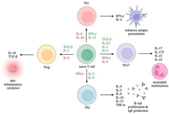 Differentiation of T cell subsets Th1, Th2, Th17, and Tregs and the production of their respective cytokines. Cytokines promoting differentiation toward a cell type are in green and cytokines inhibiting differentiation are in red.
