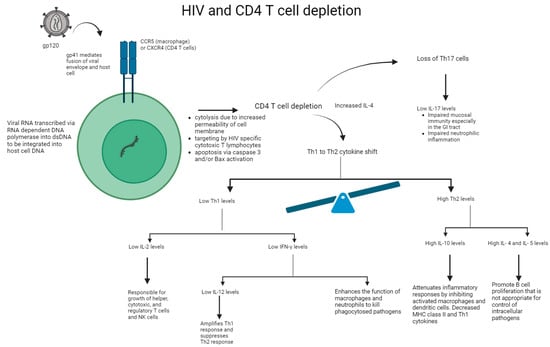 A 2008 study demonstrated a significant decrease in Th17 cells in the GI tract of patients with HIV compared with people without HIV [58]. Although the mechanism that leads to the depletion of Th17 cells remains largely unknown, some of the proposed mechanisms include (i) a lack of HIV-inhibitory RNases in human Th17 cells leading to early, sustained depletion [59], (ii) decreased levels of IL-21-producing cells responsible for maintaining Th17 cells [60], and (iii) a depletion of CD103+ dendritic cells which promote Th17 differentiation [61]. As a result, the impaired Th17 responses in individuals with HIV lead to increased susceptibility to opportunistic diseases including tuberculosis and candidiasis [62,63]. In addition, depleted Th17 cells result in epithelial dysfunction in the GI mucosa, leading to more general gastrointestinal issues including fat malabsorption, bacterial overgrowth, and HIV-related diarrhea [64]. Overall, patients with HIV demonstrate a preferential loss of Th17 cells, leading to increased susceptibility to opportunistic co-infections and compromised gut mucosal defenses against bacterial and fungal infections.