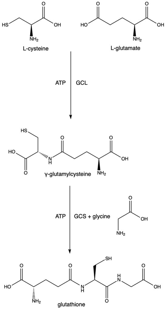 The synthesis of GSH is a two-step process depending on cysteine and glutamate as substrates. The first step is the rate-limiting step and is driven by the enzyme glutamate cysteine ligase (GCL) (previously known as γ-glutamylcysteine synthetase and γ-glutamylcysteine synthase). It catalyzes the conversion of L-cysteine, L-glutamate, and ATP into γ-glutamylcysteine. GCL is made of two subunits (GCLC (a catalytic subunit) and GCLM (a modifier subunit)). GCLC contains the active site in which the L-cysteine binds to the γ-carbon of L-glutamate. GCLM is responsible for lowering the Km of the reaction and increasing GCL’s affinity for glutamate and ATP, thus making the reaction more efficient [23]. Mutations in either of these subunits are points of polymorphisms seen at least in schizophrenia [24], stroke [25], diabetes [26], asthma [27], MI [28], and coronary artery disease [29]. The excessive synthesis of GSH results in increased melanoma growth and increased resistance to some cancer drugs and radiation therapies [30]. The second step utilizes GSH synthetase, an enzyme responsible for forming GSH from glycine and γ-glutamylcysteine. See Figure 3.