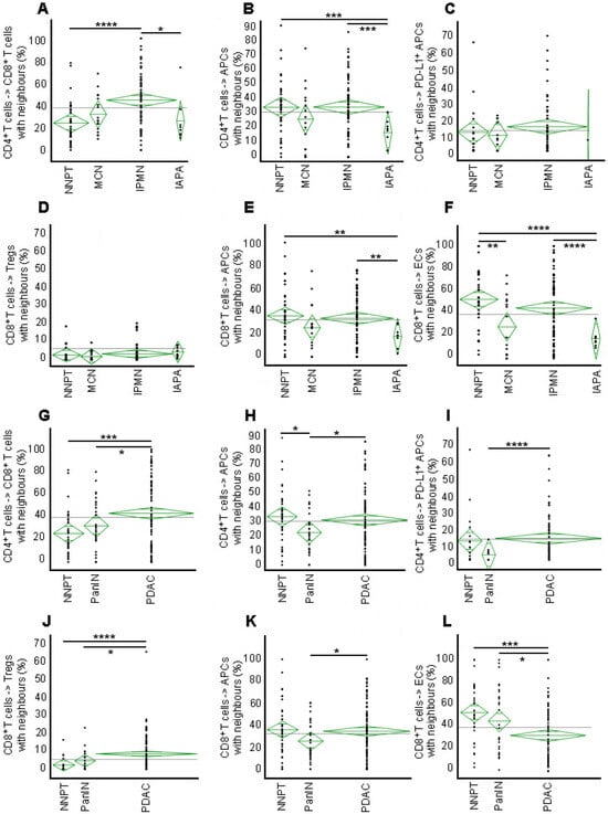 2.5. High Engagement of CD8+ with CD4+ T Cells in IPMN but Not in PanIN or IAPA—Malignant Transformation Results in Disruption of the CD8+ T Cell Interaction with ECs