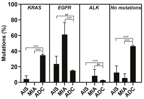 Percentages of KRAS and EGFR mutations and rearrangements in ALK in adenocarcinoma in situ (AIS), minimally invasive adenocarcinoma (MIA), and advanced adenocarcinoma (ADC). Percentage of cases without detected mutations using Oncomine Focus Assay were also included. Mean ± SEM values. *** p < 0.001. ns: not significant.