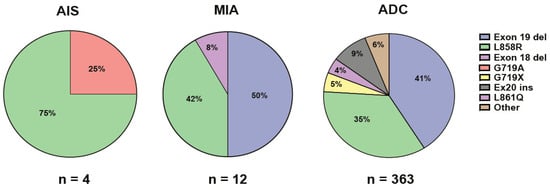 The total number of cases without detected mutations in this study were significantly lower (p < 0.001) for both AIS (12.5%) and MIA (5.5%) compared to cases with ADC (46.3%), indicating mutation-rich genetic alterations in both AIS and MIA (Figure 2). The number of KRAS mutations in both AIS (3.5%; n = 1/10) and MIA (0%; n = 0/18) were significantly lower (p < 0.001) than the number of KRAS mutations in ADC (34.6%; n = 837/2419; Figure 2). EGFR mutations were detected in 4/10 of patients with AIS (22.2%), in 12/18 of patients with MIA (59.5%), and in 363/2419 of patients with ADC (15.0%; Figure 2 and Figure 3). The incidence of EGFR mutations in MIA was significantly higher than the number of EGFR mutations in ADC (p < 0.001, Figure 2). The most common type of EGFR mutation in AIS was p.L858R (75%; n = 3/4), and exon 19 deletions (50%; n = 6/12) in MIA (Figure 3). In patients with advanced ADC, small prevalent variations in KRAS (30–38%), EGFR (13.3–16.5%), and BRAF (3.0–5.0%) mutations, and ALK rearrangements (2.0–2.9%) were detected during the study period. The most common types of KRAS mutations in ADC were p.G12C (36–45%) and p.G12D (12–17%). The most common types of EGFR mutations in ADC were deletions in exon 19 (32–53%) and p.L858R (29–42%; Figure 3). Co-mutation in KRAS and EGFR was not detected in any cases with AIS, MIA, or ADC included in this study (n = 2447).