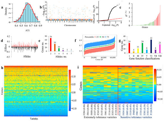 ATI gene–allele system identified in the NECSGP using GASM-RTM-GWAS. (a): Frequency distribution of the ATI at the seedling stage averaged over three environments in the NECSGP. (b): Manhattan (left) and Q-Q plot (right) of ATI candidate genes identified in the NECSGP. The horizontal solid red line indicates the threshold of p < 0.05, the upper colored dots are the significant candidate genes mapped in different chromosomes. (c) Phenotypic contribution of genes detected for ATI. The vertical axis indicates genetic contribution of a gene, while for the horizontal axis, the genes with a green color have an R2 value ≥ 1.0% and for those with a red color R2 < 1.0%. (d) Distribution of allele effect values of ATL alleles of each gene. (e) Frequency distribution of allele number per ATI gene. (f) Recombination potential prediction of ATI in the NECSGP based on the linkage model. (g) Gene ontology classifications of ATI in the NECSGP; I: Defense response; II: Material transport; III: Regulation related; IV: Metabolic process; V: Biosynthetic process; VI: Biological process; VII: Development; and VIII: unknown. (h) ATI gene–allele matrix for the NECSGP. The horizontal axis represents the varieties of each subregion which are arranged in ascending order based on their phenotypic value, while the vertical axis represents the alleles on the chromosomes. The allelic effects are represented by different colors; warm colors represent positive values and cool colors represent negative values. The darker the color, the greater the absolute value of the ATI value. (i) ATI gene–allele matrix of the top 10 tolerant and top ten sensitive varieties at the seedling stage.