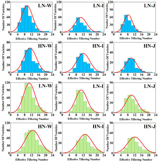 Compared to that of the high nitrogen conditions, the rice ETN was observed to be decreased under low nitrogen conditions, and the indica subpopulation ETN was higher than that of the japonica subpopulation for both years under both nitrogen conditions. ETN had coefficients of variation ranging from 29.06% to 32.30% under low nitrogen conditions, compared to 29.00% to 35.15% under high nitrogen conditions (Table 1).