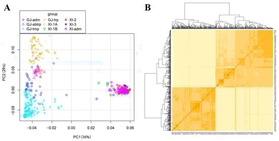 The population structure and the kinship of 469 rice. (A) Principal component analysis (PCA) plots for the first two components of 469 rice accessions. Each color represents a different population: Four populations of japonica (GJ-adm, GJ-sbtrp, GJ-tmp, and GJ-trp) and five populations of indica (XI-1A, XI-1B, XI-2, XI-3, and XI-adm). (B) Kinship heat map of 469 rice. The indica subpopulation in the lower left corner and the japonica subpopulation in the upper right corner.