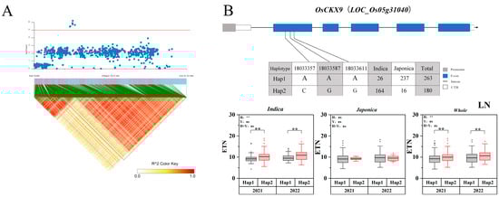 In this study, two genes co-localized with tillering-related genes from previous studies, including NAL1 and OsCKX9. OsCKX9 is a cytokinin oxidase/dehydrogenase (CKXs), which belongs to a group of enzymes that regulate oxidative cleavage to maintain cytokinin homeostasis. The OsCKX9 double mutant increased the number of tillers and the number of panicles per plant [32]. The LD of OsCKX9 is shown in Figure 3A. OsCKX9 was located 1.1 kb upstream of the peak SNP (rs5_18033587) of qLETN5-1. Additionally, three nonsynonymous SNPs were identified in the CDS region, which contained two haplotypes of OsCKX9. Most of the indica rice populations contained haplotype 2. Furthermore, the ETN of haplotype 2 were higher than those of haplotype 1 throughout the indica and whole populations (Figure 3B).