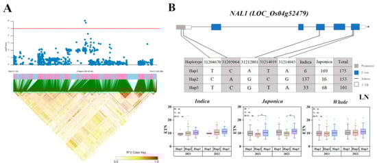 Associated region and haplotype analysis of NAL1. (A) Regional Manhattan plots and linkage distribution (LD) heatmap of NAL1. (B) Gene structure and haplotype analysis of NAL1. LD blocks indicated ± 200 kb. LN: Low nitrogen; ETN: Effective tillering number. The box plot describes the ETN distribution of a subgroup with a haplotype. Significant differences in two-way ANOVA (* p < 0.05, * indicates significant difference in average ETN among 469 accessions at p < 0.05, ns: no significant. H: Haplotypes, Y: Years, H × Y: Haplotypes × Years).