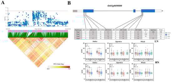 qLETNL1-2, qHETNL1-2, qLETNL2-4, qNRI2-4, qLETNL2-5, qNRI2-5, qLETNL2-6, qNRI2-6, and qLETNL4-3 were detected under multiple conditions and years and were used as the main intervals for candidate gene mining. Haplotype analysis showed significant differences among the haplotypes of five genes. Haplotype analysis was performed on five candidate genes. Os01g0690800, a gene encoding a protein containing a protein kinase domain, was detected in low nitrogen qLETNL1-2 and high nitrogen qHETN1-2. The LD of Os01g0690800 is shown in Figure 5A. Eight nonsynonymous SNPs were identified in the CDS region, constituting four haplotypes of Os01g0690800. Under both low and high nitrogen conditions, the ETN of haplotype 1 was significantly higher than that of haplotype 3 in the indica subpopulation (Figure 5B).