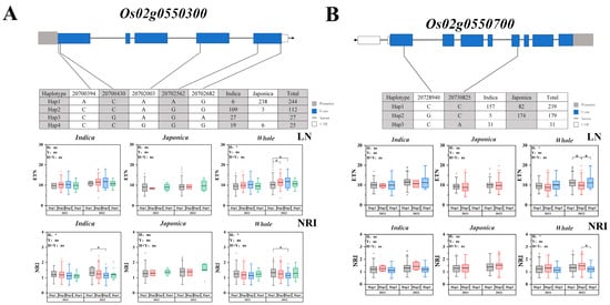Associated region and haplotype analysis of Os02g0550300 and Os02g0550700 (A) Gene structure and haplotype analysis of Os02g0550300. (B) Gene structure and haplotype analysis of Os02g0550700. LD blocks indicated ± 200 kb. LN: Low nitrogen; NRI: Ratio of high to low nitrogen. The box plot describes the ETN distribution of a subgroup with a haplotype. Significant differences in two-way ANOVA (* p < 0.05, * indicates significant difference in average ETN among 469 accessions at p < 0.05, ns: no significant. H: Haplotypes, Y: Years, H × Y: Haplotypes × Years).