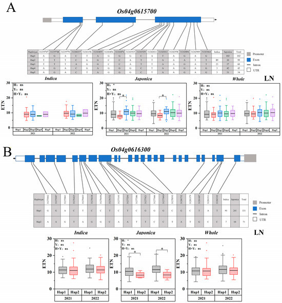 Associated region and haplotype analysis of Os04g0615700 and Os04t06163000. (A) Gene structure and haplotype analysis of Os04g0615700. (B) Gene structure and haplotype analysis of Os04t06163000. LD blocks indicated ± 200 kb. LN: Low nitrogen. The box plot describes the ETN distribution of a subgroup with a haplotype. Significant differences in two-way ANOVA (* p < 0.05, * indicates significant difference in average ETN among 469 accessions at p < 0.05, ns: no significant. H: Haplotypes, Y: Years, H × Y: Haplotypes × Years).