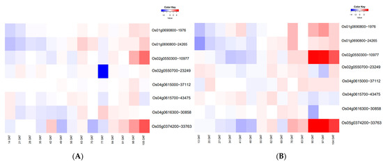 Temporal expression pattern of efficient total nitrogen (ETN)-associated genes during the whole growth period. Expression data in root (A) at 12:00 and (B) 00:00 have been downloaded from the RiceXPro website (https://ricexpro.dna.affrc.go.jp/, accessed on 7 November 2022). The heatmaps represent hierarchical clustering of relative expression levels of 12 candidate genes on different days after transplanting (DAT). The scale for relative expression levels (after normalization by z-score) is denoted by color bars, with red representing high expression levels, white representing medium expression, and blue representing low expression.