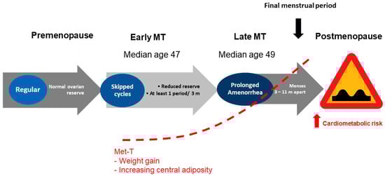 Menopause transition is accompanied by a metabolic transition that is characterized by a tendency towards weight gain and central adiposity. Abbreviations: MT: menopause transition; Met-T: metabolic transition; m: months.