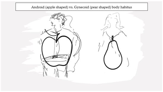 Sexual dimorphism in AT distribution is well recognized. The volume of AT as well as the regional distribution of AT vary between genetic females and males, and the fact that these differences become manifest following attainment of sexual maturity underlines a modulatory role of sex hormones in influencing AT physiology. Reproductive-age women have higher fat mass than age-comparable men []. Dr. John Vague was the first to bring to attention a sex differential in the distribution of peripheral body fat [], and multiple studies have since confirmed this observation across a wide BMI range [,,]. Overall, women have more SAT compared to age-comparable men and, conversely, men have more VAT compared to women. Furthermore, in women, a differential in AT distribution is also apparent by reproductive stage with higher VAT burden in the peri- and postmenopausal compared to premenopausal women. This lesser VAT burden in pre- menopausal women compared to age-comparable men translates to lesser risk of metabolic derangements in premenopausal women compared to men. A role for sex hormones in general and E in particular is recognized as being pivotal to the differential distribution of body fat in the gluteo-femoral (gynoid) region in reproductive-age women (Figure 2). Conversely, a role for androgens is deemed relevant for the android tendency towards central fat distribution, as is common in biological males []. Key areas in the hypothalamus, which integrate peripheral adiposity signals, such as leptin and insulin hormones, that are involved in food intake and body fat distribution, are also influenced by sex steroid hormones [,].