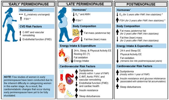Cardiometabolic health across the menopause transition and postmenopause. The menopause transition is a distinct stage of reproductive aging and is separated into two subcategories (early perimenopause and late perimenopause). It is only after 12 months of amenorrhea following the final menstrual period that a woman is said to have arrived at menopause; then onwards, the remainder of the lifetime is spent in postmenopause. Horizontal arrows (↔) indicate stability, and smaller or larger/thicker directional arrows (↑ or ↓) indicate smaller or larger changes that occur. * Although E2 concentrations are lower at menopause onset compared with premenopausal concentrations, the patterns of E2 decline and FSH rise during perimenopause are heterogenous across women. AMH, anti-Müllerian hormone; C-IMT, carotid intima-media thickness. Abbreviations: E2, estradiol; EE, energy expenditure; FSH, follicle-stimulating hormone; FMP, final menstrual period; PWV, pulse wave velocity. Reprinted from Marlatt et al. []. Reproduced with permission from John Wiley and Sons.