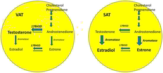 A state of relative androgen excess is suggested to be relevant to the postmenopausal shift in regional pattern of fat distribution to an androgenic phenotype [,,]. AT-specific sex steroid metabolism also plays a role. Cytochrome P450-dependent aromatase and 17β-hydroxysteroid dehydrogenase (17-βHSD) are two enzymes that are highly expressed in the AT stromal cells and in the preadipocytes. These enzymes are also expressed by ovarian stromal cells, and their expression is known to decrease in the menopausal state []. Aromatase mediates the conversion of androgens (androstenedione and testosterone) to estrogens (estrone and E2) (Figure 5). The enzyme 17-βHSD mediates the conversion of androstenedione (a weak androgen) and estrone (a weak estrogen) to the more potent counterparts (testosterone and E2, respectively). The expression of 17-βHSD is decreased relative to that of aromatase in the SAT but is greater relative to aromatase in VAT (Figure 5) []. The ratio of 17-βHSD to aromatase is positively associated with central adiposity due to increased local androgen production in visceral AT [,]. However, data on the change in relative expression of 17-βHSD and aromatase in AT in postmenopausal are currently lacking.