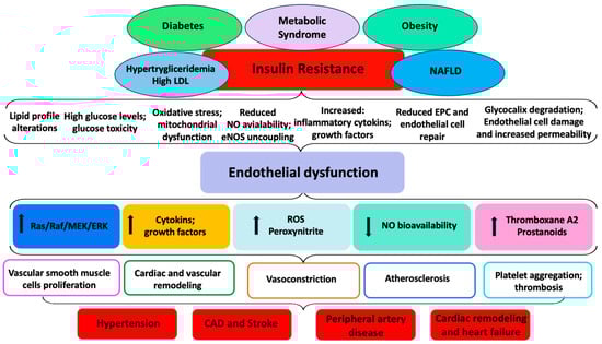 Development of endothelial dysfunction in cardiometabolic diseases: pathophysiological mechanisms. Figure legend: CAD, coronary artery disease; eNOS, endothelial nitric oxide synthase; EPC, endothelial progenitor cells; LDL, low-density lipoprotein; NAFLD, non-alcoholic fatty liver disease; NO, nitric oxide; Ras (Rat Sarcoma Virus) protein; Raf (Rapid Accelerated Fibrosarcoma) protein; MEK, Mitogen-activated protein kinase kinase; ERK, Extracellular-signal-regulated kinase; ROS, reactive oxygen species; ↑ increase; ↓ decrease.